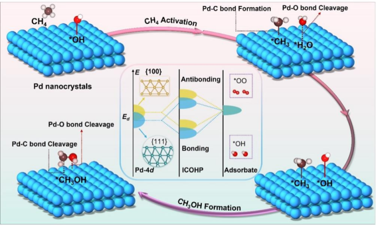 面向世界科技前沿和国家重大需求,在这一背景下,海南大学海洋清洁能源创新团队为国家“可燃冰”开发利用提供了一份“海南方案”。他们巧妙地设计出一种纳米级别的钯(Pd)催化剂,通过对晶面的精密“装修”,能够精准识别并激活甲烷分子。更关键的是,它对目标产物甲醇具有一种“快速释放”的特性:一旦宝贵的甲醇分子生成,催化平台会立即将其“弹出”,避免其在反应环境中停留过久而被过度氧化。这项突破性技术实现了两大创新,一是根据最终实验结果显示,甲醇的选择性高达99.7%,几乎实现了“零损耗”的完美转化;二是整个过程仅需70℃的低温,这意味着未来的工业化生产将更安全、更节能、更环保,具备了极高的商业应用潜力和经济价值。